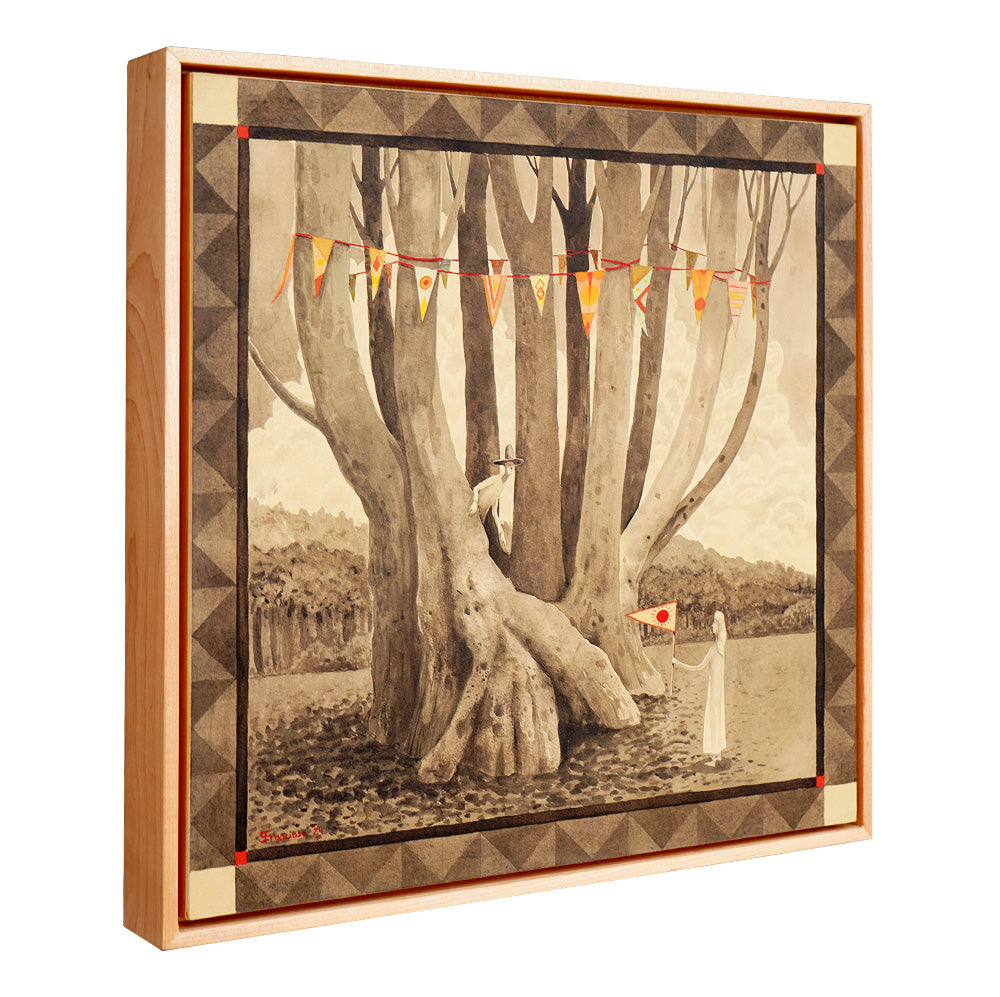 • Medium: Watercolor on cotton paper mounted onto panel, natural wood floater frame