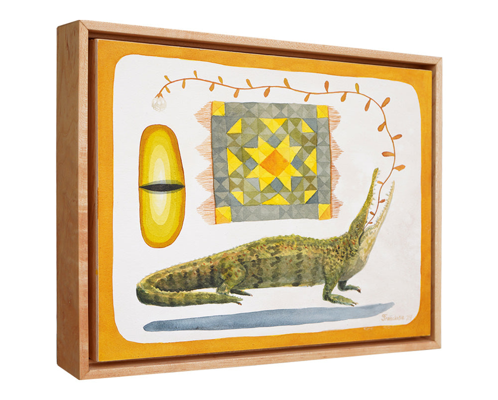 • Medium: Watercolor on cotton paper mounted onto panel, natural wood floater frame