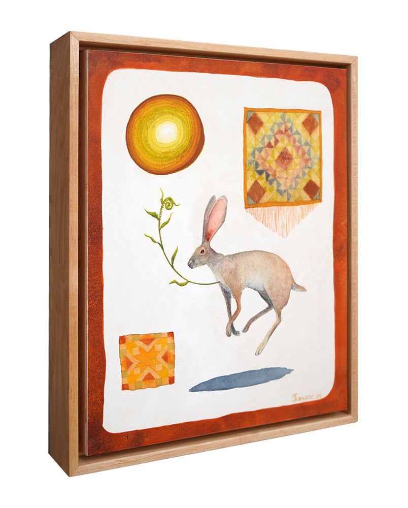 • Medium: Watercolor on cotton paper mounted on panel, natural wood floater frame