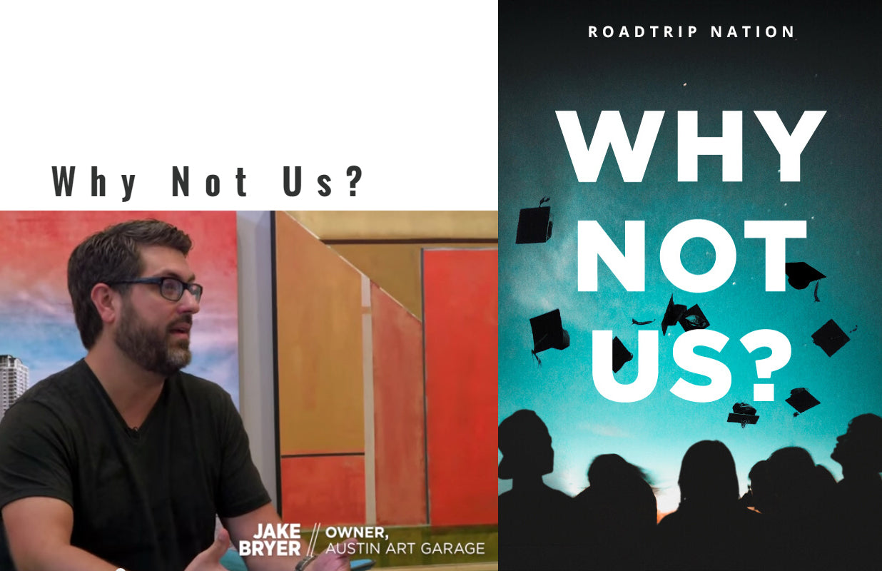 In 2015 Jake was interviewed as a leader in the art career category (chosen by Jenny Rogers) on the Roadtrip Nation Docuseries. The show recruited new grads, who were first in their families to go to college, on a road trip together. They traveled the country to interview leaders within the field of their future career interests. Among the 19 leaders interviewed included Grammy award-winner John Legend and Starbucks CEO Howard Schultz. These interviews are an amazing career resource for new grads, anyone looking for inspiration, or a career change. Click here to check them out!