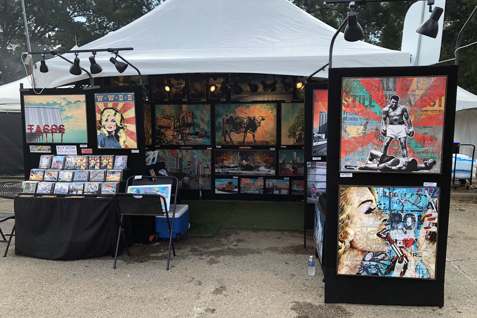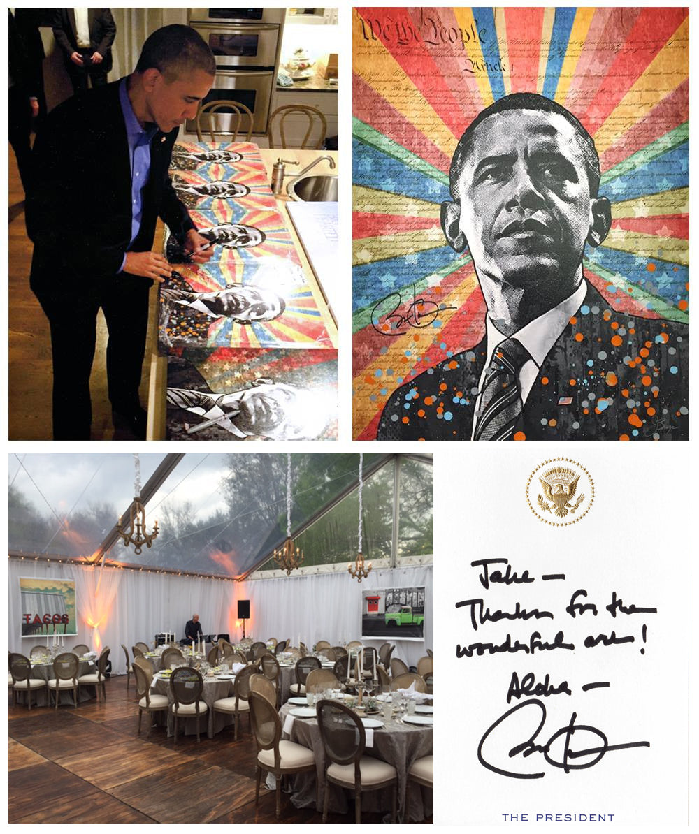 During 2016 SXSW, Jake was asked to create an Austin themed art show for a DNC fundraiser featuring President Obama. His art was used as a backdrop for the photo booth and tent walls. He also created 8x original enamel and mixed media collages to be signed by the President, the art sold out and proceeds were donated to DNC.